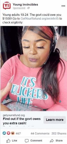 In just five weeks, the campaign generated over 141,000 homepage views to GYR.org. And as a bonus, these views turned into more than $626,000 in estimated tax refunds for 19-to-24-year-old workers. We created partnerships with nine social influencers (including seven on TikTok and two on Instagram) with predominant followings of young adults from Black and brown communities. Collectively, these influencers secured over 307,000 engagements and reached 2.7 million individuals. We also launched an ad campaign on Facebook with six sets of ad creative, which reached 1.3 million individuals, more than 80 percent of whom were within our targeted age demographic.