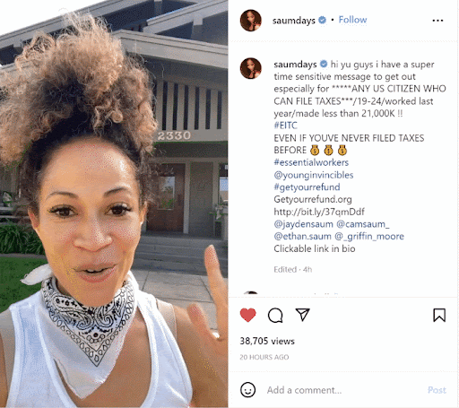 Lucky for us, the EITC Funders Network was open and ready to try something different. At kickoff, our team recommended the pilot campaign stay laser-focused on one ambitious goal: Drive low-income, young Black and brown workers to GetYourRefund.org (GYR.org), a 100 percent free tax service by Code for America where they could start filing their taxes. Putting the pilot campaign’s creative development entirely in the hands of a strategic group of authentic social influencers did so many things: