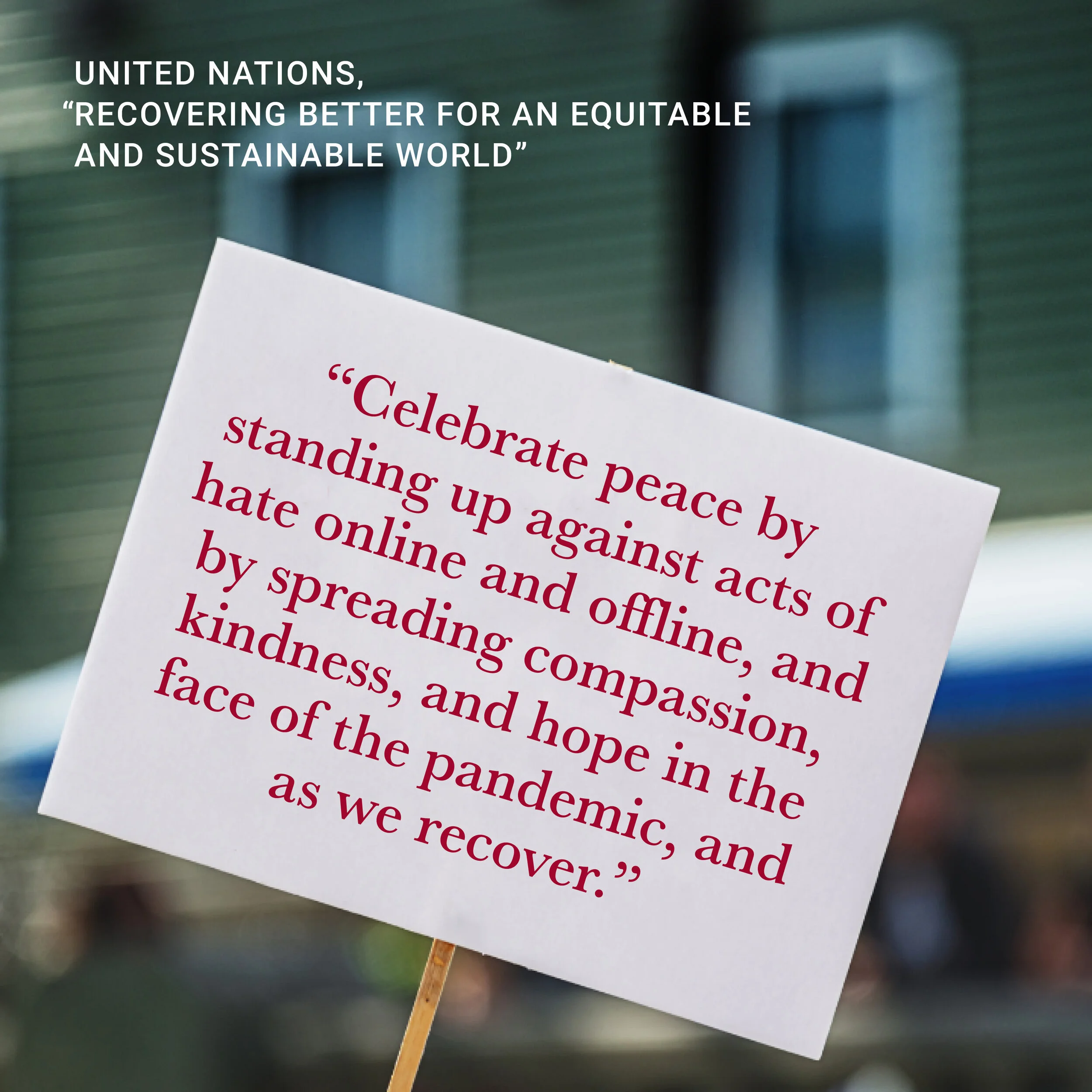 The 2021 theme for the International Day of Peace is “Recovering better for an equitable and sustainable world”. We invite you to join the efforts of the United Nations family as we focus on recovering better for a more equitable and peaceful world. Celebrate peace by standing up against acts of hate online and offline, and by spreading compassion, kindness, and hope in the face of the pandemic, and as we recover.