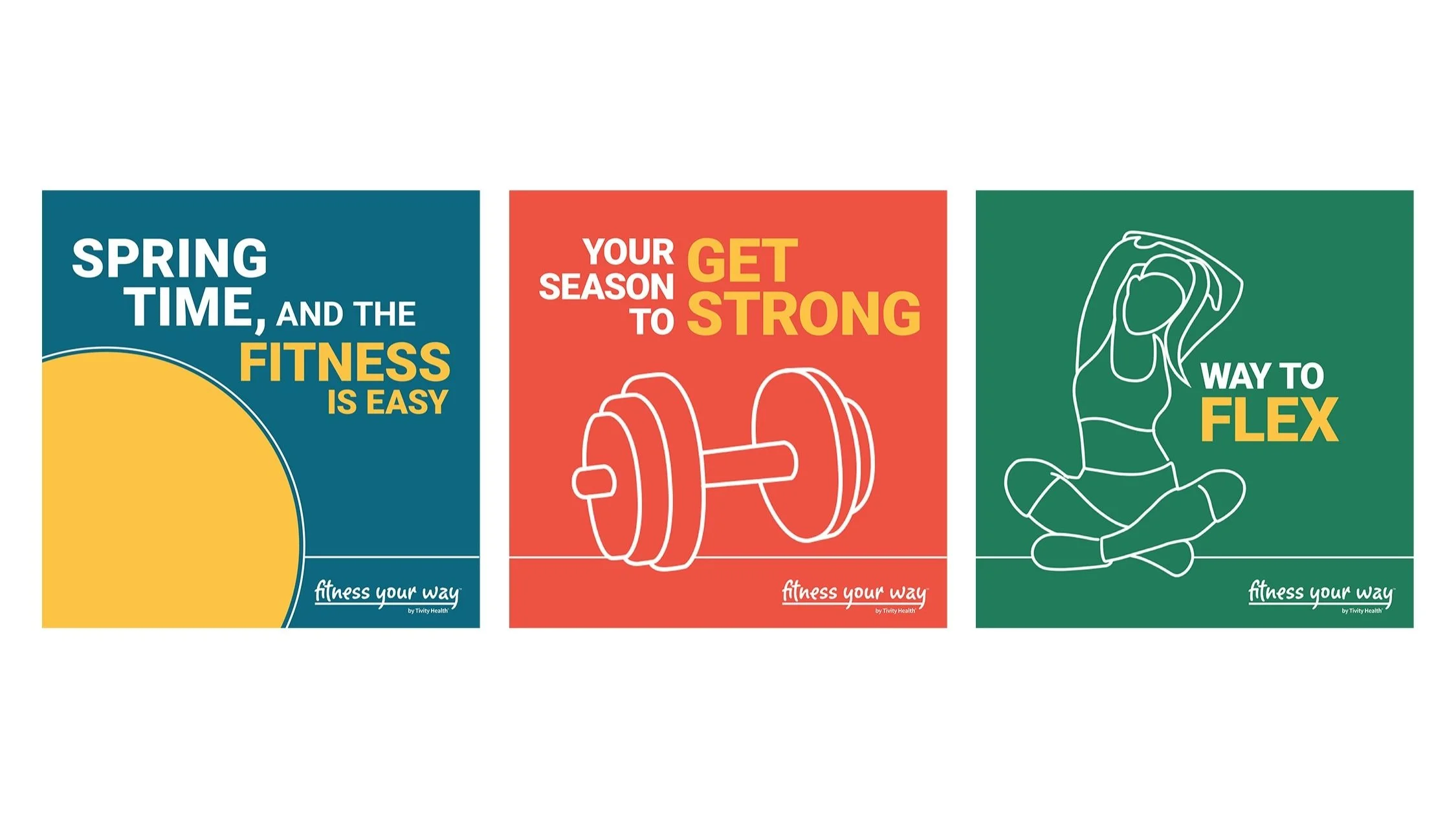 Creative Director, Paul Johnson, worked with HCC client, Tivity Health to freshen up their flyers and social posts for their partnership with Blue Cross and Blue Shield. He created new light, hand drawn visuals of people working out as an engaging visual treatment to bring a human connection to the work. The beauty of line art is that we can all see ourselves as this figure, whereas using photography of an actual person can sometimes not allow the viewer to identify quite as strongly. By bringing in the Tivity brand colors into the design and creating a system around we dramatically increased the Tivity brand in all of the creative.